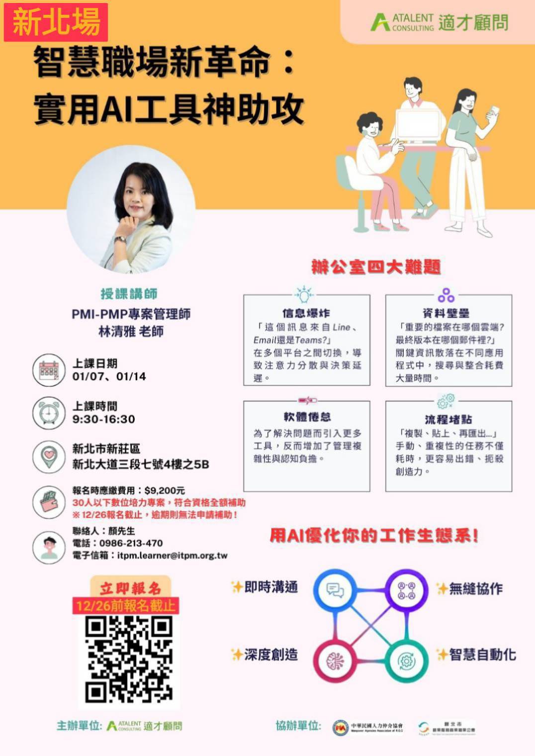 新新-課程來了>>【智慧職場新革命:實用 AI 工具神助攻】 專為解決辦公室四大難題設計。